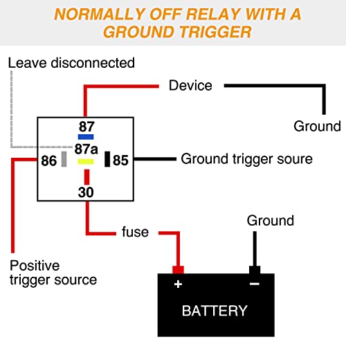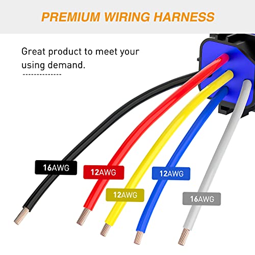 - Pre-wired Harness: Heavy duty 12/16 AWG wiring harness. Black - 16AWG Pin85, White - 16AWG Pin86, Red - 12AWG Pin30 Yellow - 12AWG Pin87a, and Blue - 12AWG Pin87