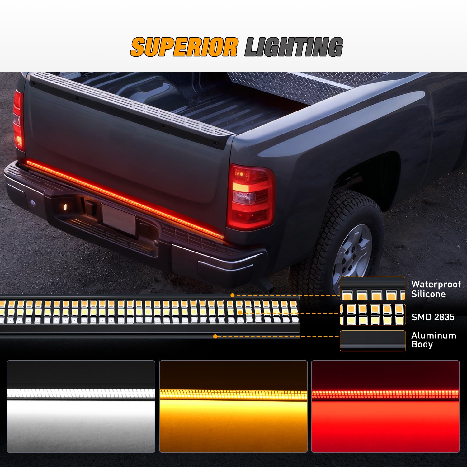 • Super Bright and Durable: This 48" tailgate light bar features an aluminum frame and 780 high-quality SMD 2835 LED chips, providing super bright red, yellow, and white lights. It ensures your safety on the road, day and night, with efficient output and a lifespan over 50,000 hours